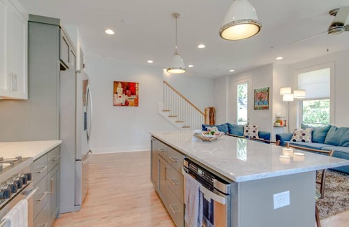 El área de la cocina cuenta con asientos de taburete paralelos a la isla grande, mesa de comedor con 7 sillas, todos los electrodomésticos nuevos y está completamente equipada con abundantes suministros de cocina, platos, cristalería, licuadora y cafetera Keurig. La sala de estar está decorada con una mentalidad contemporánea acompañada de nuestra gran televisión flotante. La sala de estar fue diseñada para maximizar el espacio del área abierta, haciendo que la casa se sienta aún más grande.