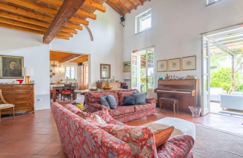 "Ca' del Vento", villa 7 habitaciones 450 m2 en 4 plantas. Espacioso, parcialmente abuhardillada, con mobiliario confortable y antiguo: salón-comedor abierto grande con chimenea, mesa de comedor, TV satélite, radio, CD y equipo de música. Salida a la terraza, pérgola. Grande cocina (horno, lavavajillas, 4 fuegos, tostadora, hervidor de agua eléctrico, congelador, grill, cafetera eléctrica, horno para pizza) con pequena mesa de comedor. Salida al jardín. WC separado. Planta superior: altillo abierto con 1 cama. 1 dorm abuhardillado con 1 cama. 1 dorm. con 2 camas y ducha/WC. Planta superior 2: 1 dorm. doble con 1 cama de matrimonio (160 cm). Baño/bidet/WC. Planta superior 3: 1 dorm. doble, abuhardillado con 1 cama de matrimonio (160 cm). 1 dorm. doble, abuhardillado grande con 1 cama doble. Ducha/WC. Calefacción de gas (extra). Suelo de parquet, suelo de piedra natural. Terraza pequeña terraza grande parcialmente cubierta. Muebles de terraza, tumbonas (10), porche, rincón para sentarse. Vista panorámica bonita al valle y al paisaje. El alojamiento dispone de: lavadora, plancha, trona, cuna hasta 2 años, secador de pelo, leña (gratis). Internet (Wifi, gratis). A tener en cuenta: casa para no fumadores. Permitido máximo 1 mascota / perro. Entrada privada. CIR: 018187-CNI-00002