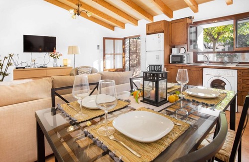 En las afueras de la ciudad de Sóller, la casa de vacaciones Ca'n Doi goza de una ubicación ideal con vistas a la montaña. El alojamiento ofrece una cómoda sala de estar con un sofá cama para 2 personas y vigas de madera rústicas en el techo, una cocina americana muy bien equipada, 2 dormitorios, un baño moderno, así como un medio baño adicional en la zona exterior, por lo que puede alojar a 6 personas. Las comodidades también incluyen Wi-Fi, aire acondicionado en todos los dormitorios, chimenea, televisión LCD con conexión USB, una cuna y una trona. Pase unas vacaciones relajantes en la zona exterior, donde encontrará una barbacoa, una zona de comedor, sombrillas, tumbonas y una ducha exterior, y deje atrás el estrés de la vida cotidiana. Uno de los aspectos más destacados es la piscina, que le invita a darse un refrescante chapuzón en los calurosos días de verano. Disfrute del ambiente mediterráneo y de las impresionantes vistas de las montañas en el horizonte. Debido a su ubicación ideal, encontrará un restaurante y un bar a 80 m y una cafetería a 120 m. La hermosa playa de arena Platja d'en Repic en Port de Sóller está a 4 km o a 8 minutos en coche de la propiedad. Escuche aquí el suave sonido de las olas, broncéese bajo el sol mallorquín y pase unas vacaciones únicas con los suyos.