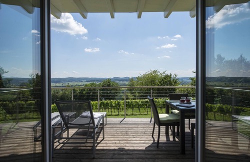 con una maravillosa vista de Riegersburg, el amplio valle de Raab y el viñedo de enfrente.