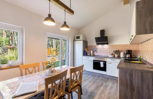 Un dormitorio tiene una cama doble de 160x200, en el segundo dormitorio hay una litera para los huéspedes. Hasta 5 personas pueden alojarse en la casa de vacaciones.