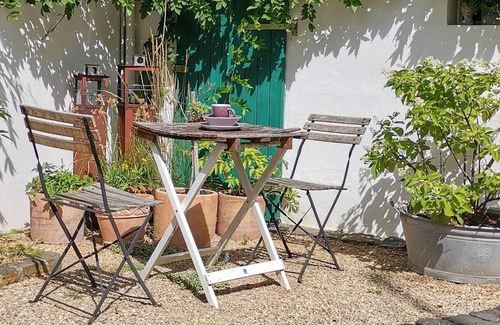 Incluso en climas lluviosos, el patio con un diseño amoroso invita a las horas acogedoras, ya que parte de la zona de asientos está cubierta. El patio se ofrece para uso compartido.