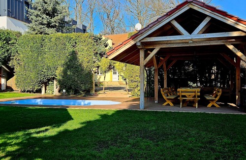 Gran casa de vacaciones con mucho espacio para pasar unas vacaciones en familia o con amigos. Un gran jardín le invita a relajarse, jugar o hacer una barbacoa, y podrá refrescarse en la piscina privada al aire libre en los calurosos días de verano. A sólo 300 metros se puede llegar a un lago, donde podrá disfrutar de la paz y la tranquilidad e ir a pescar. El pequeño pueblo de Kolczewo se encuentra en el centro de la isla de Wollin, directamente en el lago Kolzow y a sólo tres kilómetros de las playas del mar Báltico. Aquí podrá disfrutar de la paz y la tranquilidad de la naturaleza, pero aún así podrá llegar rápidamente a los animados centros turísticos costeros del Mar Báltico. Los autobuses de línea también llevan cómodamente a las ciudades de Kolberg o Świnoujście y en verano incluso circulan con bastante frecuencia. Reflejos: Costes energéticos basados en el consumo, ropa de cama, toallas, limpieza final. Wi-Fi Impuesto turístico Actividades cercanas: Gran parte de la isla Wolin está protegida como parque nacional. Aquí podrá realizar maravillosos paseos a pie y en bicicleta. Las sirenas playeras y los amantes del baño encontrarán la felicidad en la localidad de Misdroy, en el mar Báltico, una de las más bellas de la costa polaca. Allí también se encuentra el Museo del Parque Nacional. Una visita al recinto de bisontes es emocionante para toda la familia. Movilidad: No apto para personas con movilidad reducida.