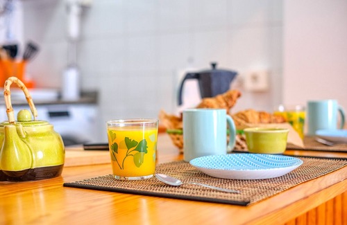 El apartamento cuenta con dos dormitorios: uno con cama de matrimonio y otro con dos camas individuales, ambos equipados con amplios armarios, ideales para estancias largas o para familias. Dispone de un baño completo con bañera, lavabo, WC y bidet. La ropa de cama y las toallas están incluidas, con reposición cada 10 días. La cocina, de estilo americano, está completamente equipada con vitrocerámica de 4 fuegos, nevera, congelador, microondas, horno, cafetera italiana, hervidor de agua, tostadora, exprimidor y todo el menaje necesario para cocinar cómodamente.