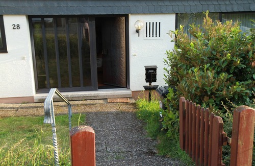 Es mejor estacionar su automóvil frente a la casa en la calle (que solo está restringido al tráfico para los residentes). La casa en sí está orientada al sur y ofrece una vista clara sobre el pequeño prado que aún pertenece a la propiedad, sobre el Bosbach rodeado de prados y la hilera de pueblos más allá de las colinas boscosas opuestas.