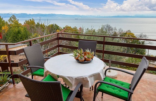 Pase unas vacaciones mágicas en esta acogedora casa de vacaciones con vistas panorámicas al mar desde la terraza.