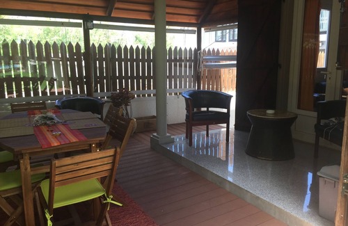 El alojamiento es tranquilo con su terraza muy ventilada durante los períodos de mucho calor. El jardín con sus cocoteros y plátanos. La piscina para relajarse después de un buen día va a la playa.