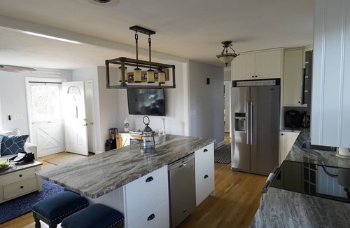 ¡Disfrute de sus vacaciones de verano en el pintoresco pueblo de Snug Harbor! Renovado en 2018-2019 y listo para sus vacaciones en South County! ¡Conduce tu bicicleta de playa hasta la playa estatal de East Matunuk a solo una milla de distancia! En el camino de vuelta, deténgase en el internacionalmente famoso Matunuk Oyster Bar para degustar ostras frescas y un cóctel. ¡Recién instalado, Central A / C para noches frescas! NUEVA cocina incluye: electrodomésticos de acero inoxidable, encimeras de granito. Cocina eléctrica con microondas arriba, lavaplatos en la isla, refrigerador con agua / hielo y microondas. Basurero. Pisos de madera recién terminados a lo largo. ¡¡GRAN isla que se sienta 6 para el entretenimiento final !! Salpicado de sol Sala de estar con todos los muebles nuevos, iluminación y centro de entretenimiento. Incluye WiFi, sonido envolvente Bose, HDTV de 55 pulgadas, Roku Ready con YouTube TV que incluye todos los canales locales y un paquete deportivo para que no te pierdas un juego. 3 habitaciones, todas con muebles nuevos en 2018. Maestro con reina y televisor de pantalla plana de 38 "y mucho espacio de guardarropas (para 2 personas). 1er dormitorio de invitados con otra reina, televisor de pantalla plana y armario doble (para 2 personas). La segunda habitación de huéspedes tiene 1 doble y una doble que puede jalarse hasta una reina (para 3 personas). Todas las habitaciones están equipadas con ventiladores de techo. Baño en la planta principal con ducha de pie y un montón de espacio de tocador. Lavadora y secadora incluidas en el sótano. Cubierta grande fuera de la sala de estar con una nueva parrilla de gas de 5 quemadores y un juego de patio con sombrilla para el asiento 6. La escalera de la cubierta conduce al patio trasero con fogón a gas y asientos para 6 personas en un patio recientemente cercado. Parking para 3 coches fuera de la calle.
