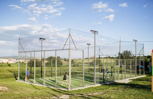Al exterior, totalmente rodeada de campos, ofrece varios espacios: un gran jardín con piscina exterior privada, WC justo al lado, pista de pádel privada y un gran espacio exterior con canasta de básquet, portería de futbol y columpios. Además, hay espacio privado para los coches de todos los huéspedes.