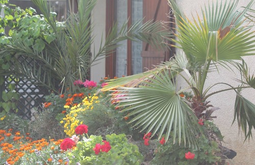 terraza llena de flores, jardín, muebles de jardín y barbacoa. Calma y tranquilidad. Propietarios de cerca. Tiendas y servicios 8 km (Fleurance).