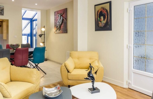 Casa adosada: Planta baja: - gran entrada, - sala de estar - sala de estar (TV de pantalla plana) con área de oficina, - patio que sirve de comedor (TV de pantalla plana), - cocina equipada (cafetera, nevera americana, cafetera de cápsulas, cocina a gas, robot de cocina, etc.) - 1 dormitorio para 2 personas (1 cama de 160x200cm) con TV de pantalla plana, - Baño - wc separado, 1er piso: - 1 dormitorio para 2 personas (2 camas 90x190cm), - 1 dormitorio para 3 personas (1 cama de 90x190cm y 1 cama de 160x200cm), - Baño, - aseo independiente, - área de lavado (lavadora, secadora). Exteriores: Pequeño patio ajardinado de 150m2 totalmente cerrado: tumbona, muebles de jardín, barbacoa. Atención: estacionamiento solo en la calle. En el corazón del Pueblo de Forges les Eaux, casa adosada completamente renovada con gusto y pasión por el arte. Los espacios de vida son tan cálidos como los espacios de noche. Puede encontrar cerca el Casino, el campo de golf, la piscina y todas las tiendas necesarias. Gastos de alquiler no incluidos en su alquiler: - calefacción (pago de la electricidad después de la lectura del contador a la llegada y a la salida por encima de 10 kw/h por día, a precio de coste), - las tareas domesticas, - la tasa turística. dormitorio(s) en la planta baja, TV, Calefacción eléctrica, Cuna, Sábanas incluidas, Ropa de hogar, Conexión a Internet, Lavadora, Lavavajillas, Alquiler de ropa blanca, Tarifa limpieza, Terraza, Secadora, Microondas, Hi-Fi, piso TV de pantalla, Congelador, Muebles de jardín, Barbacoa. Opción de pago en el sitio: Cargo limpieza: 80€. A menos que se indique lo contrario, los servicios como la limpieza, la ropa de cama, las toallas, etc. no están incluidos en el precio de este alquiler. Si se admiten mascotas (información en el anuncio), pueden aplicarse suplementos. Sólo están presentes los equipos específicamente mencionados en este anuncio. Los equipos no mencionados no se consideran presentes.