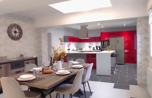 Esta casa rural ofrece un gran salón de 50 m² con un salón equipado con un televisor de pantalla grande y una chimenea (leña incluida), así como una cocina moderna totalmente equipada (horno, microondas, frigorífico/congelador, lavavajillas, cafetera de cápsulas y de filtro).