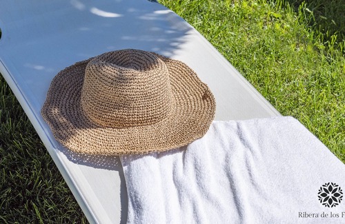 Tiene una zona acotada de unos mil metros donde está la piscina rodeada de césped natural con sus sombrillas de brezo y sus hamacas, una gran barbacoa, una zona con un shill out debajo de una pérgola y otra zona para comer con mesa a la sombra del nogal que hay al lado de la casa, además otra zona con una mesa de ping pong.