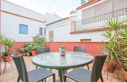 Among the magical alleys of Seville, you will find this typical Andalusian house. Outside you will find a large terrace with a dining area where you can relax with your companions or sunbathe on the sun loungers while enjoying the warm climate of the south. Being centrally located, there are direct neighbours and privacy is partial.