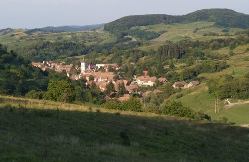 Idílicamente situado a las afueras del pueblo en un valle verde en medio del paisaje montañoso de Transilvania.
