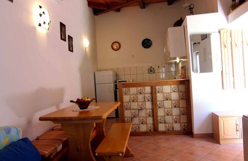 Casa vacacional con jardín Su alojamiento turísticoLa casa vacacional se encuentra en una granja y está rodeada por un abierto (200 m²) con prado, flores y arbustos. El propietario vive en un edificio separado dentro de la misma propiedad. Para uso a su disposición: barbacoa. Su casa vacacional1 planta, 2 habitaciones (de los cuales 1 dormitorio), 50 m², 3 personas. Entrada en planta baja. Salón/dormitorio con 1 cama adicional en sofá-cama, rincón para sentarse, zona de comedor (4 plazas), televisión y acceso a la terraza (muebles de jardín, 1 mesa, 4 sillas). Dormitorio con 1 cama doble. Rincón cocina con cocina de gas (3 fuegos), cocina eléctrica (1 fuego), horno, nevera (congelador), cafetera y hervidor eléctrico de agua. Baño con ducha, 1 lavabo, inodoro y ventana.Otras instalaciones: acceso de internet (WLAN). Recepción televisiva vía satélite. En la casa vacacional está prohibido fumar. Animal domésticopermitido, EUR 20.00/Animal doméstico y día. UbicaciónPovile. La casa vacacional en estilo típico de la región (año de construcción 2004) se encuentra separada, en una granja, en la periferia de la localidad y en una tranquila y una soleada ubicación. Vista de la propiedad sobre el mar. El acceso se realiza por un camino (asfaltado). Aparcamiento en la propiedad. Compras 500 m, restaurante 500 m, centro de la localidad 500 m. aeropuerto en Pula 35 km. En el veranoMar Adriático 700 m en Povile (playa 700 m en Povile con gravilla, piedras y rocas). tenis, minigolf, montar a caballo respectivamente 2 km en Novi Vinodolski. pescar, buceo, posibilidades de deporte acuatico, alquiler de barcos, embarcadero respectivamente 700 m en Povile. Condiciones y preciosEn el precio incluidoacceso de internet, aire acondicionado, estacionamiento, electricidad, gas, agua, paquete de ropa (toallitas, ropa de cama), WLAN acceso de internet. Costes adicionales-Suplementos(Pagable en el momento de la reserva)/póliza de turismo.Costes en el lugar/destino:/Obligatorio:limpieza final 40 € por objeto/alojamiento por estancia.A petición:lavadora 10 € global por semana.Fianza:100 Euro
