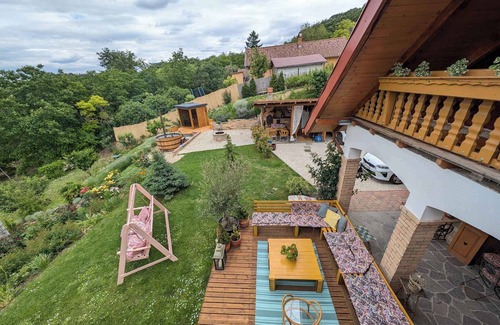 Casa vacacional en un paisaje pintoresco con cocina de jardín y barril de madera con bañera de hidromasaje | Casa en Balatonendréd