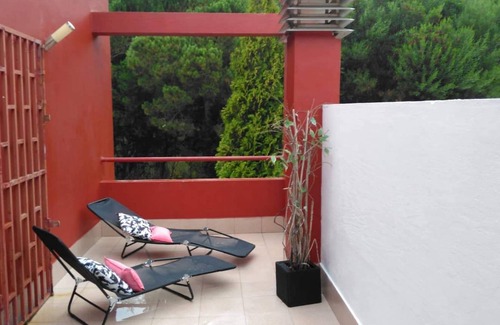 Casa de 2 dormitorios (una enorme con 2 camas dobles y otra con una cama doble y una cama individual), cocina totalmente equipada, parte trasera de la casa con ducha y barbacoa con mesa de piedra donde podrá disfrutar de buenas barbacoas, excelente balcones en habitaciones de estilo solarium con tumbonas, televisión por satélite en dormitorios y sala de estar, internet wi-fi ... 3 minutos de la playa y 5 minutos de locales nocturnos (famosa discoteca pacha) combina la playa con diversión y viene tus vacaciones en un lugar muy tranquilo y agradable