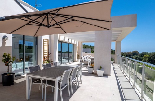 La vista está despejada en 180 grados, se puede ver el mar, las montañas, una ladera de viñedos y el golf de Casares accesible directamente a pie. La orientación principal es al sur, pero el sol ilumina la inmensa terraza desde primera hora de la mañana hasta el atardecer. El apartamento es muy luminoso y está equipado con aire acondicionado (reversible en modo calefacción para el invierno) en todas las habitaciones.