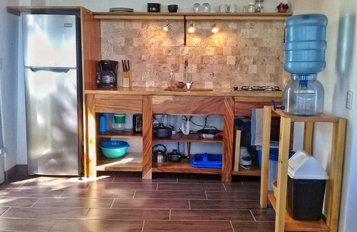 New 1 Bed/1Bath plus loft with an imported king bed in the bedrrom, a twin in the loft and a sofa bed in the living room. Amazing views, Netflix, Starlink WiFi, full kitchen, solar hot water with great pressure, imported beds and couch, built by an American with 20 years building experience. Amazing quality for Guatemala. Pavilion, hammocks, fire pit with a grill top, property filled with fresh fruits and veggies, and peace and quiet on the side of Volcano San Pedro. Five minutes from town by tuc tuc or 15 minutes walking. 15 minute hike to a great semi-private beach and the coffee Finca. Owners live on site along with 3 other Casitas below. Must climb 100+ stairs between the road and the casita. House wines, beer, and water available upon request.