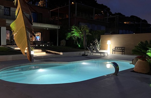 Esta preciosa casa está ubicada en Castelldefels, cuando entra en la casa desde la calle se accede desde el garaje que está en la parte superior de la casa y luego se va entrando en la casa bajando por las escaleras o el ascensor interior. La casa tiene 3 niveles, cuando se va a la parte del medio llega a las habitaciones y los aseos, luego en la parta más baja de la casa encontramos otra habitación, una sala donde está la secadora, lavadora y otros electrodomésticos. Al lado hay una espaciosa cocina donde puede comer en una mesa mirando la piscina exterior. Al lado de la cocina tenemos una inmensa sala de estar donde poder descansar y comer. En el exterior encontramos un jardín con una piscina y una terraza cubierta que se accede desde el salón, con un pequeño chill-out . En los alrededores podemos encontrar algunos restaurantes y si quiere ir a los supermercados y otros comercios de Castelldefels, puede llegar en 15 minutos andando. Si quiere ir a la playa, puede llegar en coche en unos 7 minutos. Hay una estación de tren también a 15 minutos andando. Está muy cerca de Barcelona y próximo al aeropuerto. Es un destino ideal para pasar unas bonitas vacaciones.