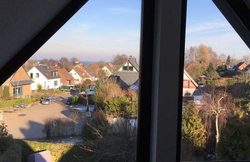 Arriba, hay 3.5 muy agradable y acogedor y moderno dormitorio con colores neutrales. 1 individual, 1 doble y una habitación doble (para max. 5 adultos) incl. El acceso a la buhardilla a la altillo. En el ático con vistas a Strander Bay / Báltico max. 2 niños duermen en colchones. También se encuentra el baño de arriba con bañera y ducha incl. WC.
