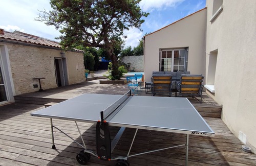Relájate en la piscina al aire libre o tómate algo en el jardín de esta casa de vacaciones de 140 m² que, además, cuenta con un porche o patio y muebles de exterior. En cuanto al interior, puedes poner a prueba tus habilidades jugando al tenis de mesa, o disfrutar del wifi, de la televisión por satélite o cable y del reproductor de DVD.