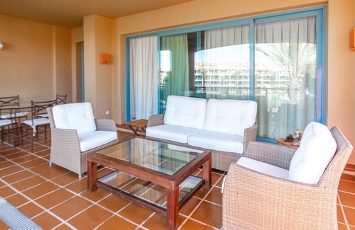 Apartamento de lujo, La Marina Sotogrande. Amplio y luminoso, 130m2, magníficas vistas a los canales. armarios empotrados y 2baños completos. Dormitorio principal en suite. Cocina totalmente equipada. Todo exterior. Vajillas, cristalería, cubertería, ropa de casa de calidad. Salón con chimenea. Preciosa terraza cubierta, chill out y comedor de verano, orientación sur. 2º piso, ascensor y acceso desde garaje. AC y calefacción en todas estancias. Wifi. Altas calidades. Ideal familias.