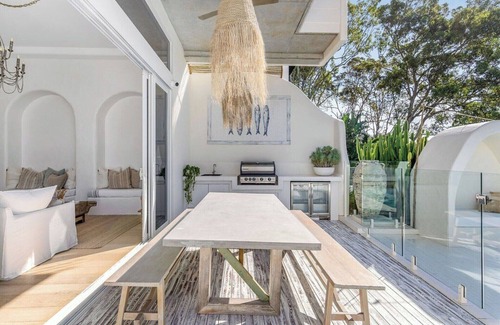 Outdoor Bliss: Burleigh Heads Villa 1096outdoor space is where the magic truly unfolds. Picture yourself dining al fresco at a grand precast concrete table, overlooking your private saltwater pool. The pool area, adorned with white tiles and decks, becomes a personal paradise, especially as night falls and the shimmering pool lights and festoon lighting transform the space into a Mediterranean dream. A luxurious outdoor shower, reminiscent of the sun-dappled Greek isles, awaits you—a perfect prelude or finale to a refreshing swim.