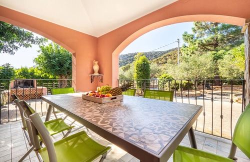Situado entre dos colinas rodeadas de vegetación, villa en villa totalmente climatizada, compuesta de. sala de estar con dos sofás, dos habitaciones dobles y una con dos camas individuales, dos baños con ducha, una pequeña cocina con nevera y un pequeño congelador, antesala con lavadora, una gran terraza donde se puede comer y mosquiteras en las ventanas.