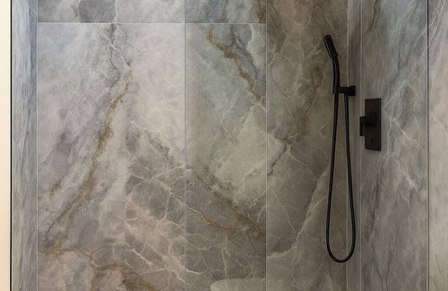 A modern bathroom with a spacious walk-in shower, high-quality fixtures, and a gold-accented sink. Guests will find shampoo, conditioner, a hair dryer, and fluffy towels.