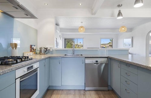 Step inside to find a light and airy interior equipped with cosy furnishings and coastal décor. A stylish living-dining space enjoys year-round comfort from the heat pump, while the well-appointed kitchen boasts cool-toned cabinetry, quality appliances and a breakfast bar.