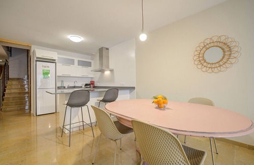 Al entrar, se encontrará con una cocina abierta al comedor, equipado con una mesa grande que puede acomodar hasta seis personas. Además de tener un aire acondicionado, tambien tendremos acceso a la terraza donde comer aprovechando la luz del sol.