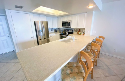 Bay View Tower 734: nuestros alquileres vacacionales cuentan con electrodomésticos nuevos, que incluyen un refrigerador y horno de acero inoxidable, gabinetes de cocina y baño renovados y una gran televisión de pantalla plana de alta definición en la sala de estar. Azulejos en la cocina y sala de estar. Abierto y espacioso; Luminoso y luminoso todo el día. Gran mesa de comedor y área de taburetes. Nueva alfombra en las habitaciones. Este condominio de Sanibel Harbour en Gulf Shores tiene excelentes vistas desde el balcón y el dormitorio principal. Cama King en el maestro, una reina en el dormitorio de invitados.