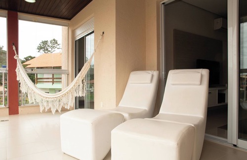 - Amplo deck coberto com churrasqueira e rede para relaxar;