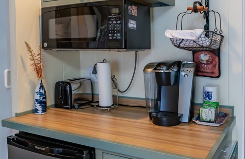 La cabaña tiene capacidad para 2 a 4 personas, con suficiente espacio para llamar a casa por unos días o semanas. Es una gran casa de estudio amueblada con una cama tamaño queen y un sofá futón que se convierte en una cama doble, una cocina pequeña equipada con microondas, mini refrigerador / congelador, cafetera Krups, tostadora, licuadora, olla de agua caliente y productos necesarios. Utensilios y platos. Siempre a su disposición si necesita algo más, estoy aquí para ayudarlo.