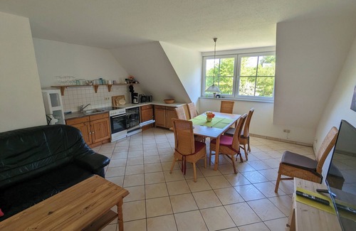 Getaway place with private beach (100m walk) and 2 rowing boats included. Fantastic location right at a meadow. Large dining table for 12-16 people allows for family and friends reunions, gatherings and getaways. Area is abundant with lakes. Eagles and wolves live near by. Several apartments allow for tailored stays according to group size.