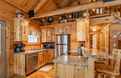La cabaña de Newton Creek ofrece un área de lofted con cama queen y TV, 2 dormitorios adicionales en el piso principal que cuentan con camas personalizadas de registro tamaño queen. El baño completo también se encuentra en el piso principal. La cocina equipada ofrece a los huéspedes la oportunidad de preparar sus propias comidas. El comedor tiene una mesa 4 sillas y un banco. El salón tiene dos mecedoras con reposapiés y un sofá de tamaño completo con sillones reclinables, TV y reproductor de DVD. La cubierta cubierta tiene parrilla de gas y muebles de cubierta, un excelente lugar para relajarse y disfrutar de su café de la mañana o una comida.