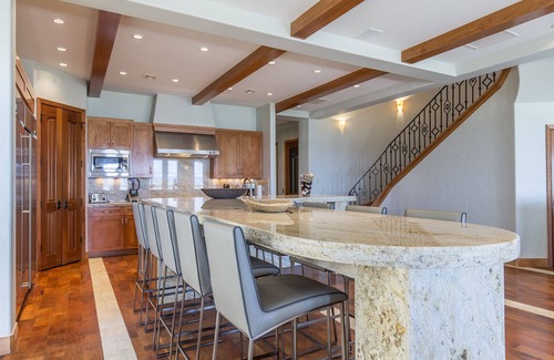 ¡La propiedad de alquiler de vacaciones en la joya de la corona en South Padre Island! 4616 Gulf (South) es una casa adosada frente a la playa de 7 dormitorios / 7 baños con piscina privada y jacuzzi. La decoración interior de esta lujosa finca de más de 5500 pies cuadrados frente al mar es impresionante. El primer piso abarca un gran concepto abierto para la sala de estar, el comedor y la cocina. La cocina es perfecta para hacer grandes comidas familiares. La cocina está diseñada para un chef, con un amplio espacio de encimera para la preparación de comidas, un refrigerador y un congelador enormes, una máquina de hielo y una estufa de propano masiva. El gran espacio en el mostrador ofrece mucho espacio para asientos adicionales cerca del área de comedor. La sala de estar cuenta con un televisor de pantalla plana grande con un sofá grande que puede acomodar a los huéspedes mientras ven sus películas o programas favoritos. Los huéspedes de alquiler pueden disfrutar sentados en la sala de estar, el comedor o la cocina mientras contemplan las hermosas vistas del Golfo de México. El segundo y tercer piso tienen 5 dormitorios, cada uno con su propio baño privado. Las habitaciones son todas excepcionalmente grandes, especialmente las suites principales. Los baños tienen un trabajo de azulejos increíblemente detallado y ofrecen a los huéspedes un amplio espacio. Esta casa ofrece balcones en el frente y en el patio trasero, ya sea que quieras ver a tu familia y amigos jugar en el área de la piscina, o pasar el rato en el Oceanside, donde puedes ver las hermosas playas de arena blanca de South Padre Island. En el otro lado de la zona de la piscina, hay una "suite para la madre en la ley" muy grande que incluye una sala de estar, un comedor y una cama. Hay un baño privado ubicado aquí también. Esta suite está ubicada sobre el garaje para dos autos y ofrece un área privada, separada de la casa principal. 4616 Gulf es una propiedad frente a la playa única, y es el alojamiento perfecto para unas vacaciones de lujo en la playa. Haga sus reservas hoy para esta magnífica finca frente al mar!