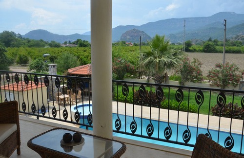 Villa de lujo, completamente nueva para 2007, situada en su propio terreno. Constucto y amueblado a un nivel muy alto que consta de 7 habitaciones dobles, todas con baño. Fuera hay acceso para discapacitados. Sala de juegos con TV / DVD y Playstation y un sofá cama para dormir a otras dos personas si es necesario. Gran cocina abierta y sala de estar con 42 "plazma satilite TV. Gran área de descanso en el patio con gran piscina exterior, con fuente de agua característica. Barbacoa exterior y ducha. Magníficas vistas de las montañas. Situado en una zona rural de Dalyan en la carretera de la playa , pero dentro de los 15 minutos a pie o 3 minutos en coche hasta el centro de Dalyan.