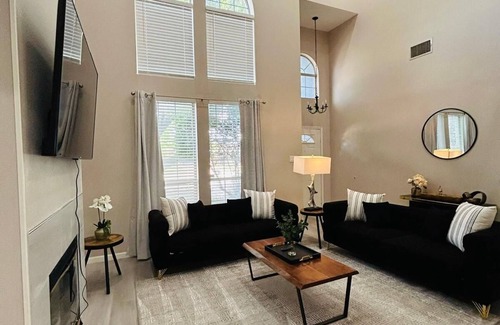 Step through the inviting covered entryway into a bright, open foyer that leads into a generously sized living room with soaring vaulted ceilings—perfect for relaxing after a busy day in Fort Worth. Whether you're traveling with family, friends, or colleagues, this home provides comfort, space, and modern amenities to meet your every need.
