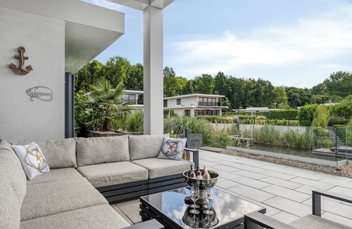 Detached 6-person villa by the water with a cosy living room featuring a piano and fireplace, modern kitchen with cooking island, and a sunny garden with lounge set. | Casa en Zeewolde