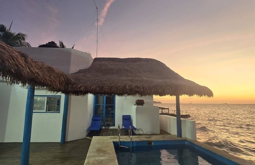 Villa privada a la orilla del mar con escalones para el acceso privado a la playa, cuenta con una alberca con vista a la playa y palapa exterior.