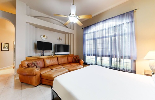 Sleeping arrangements on the first floor include the primary suite and a second bedroom. The primary suite is spacious and features a crib, a comfortable sofa, a smart TV, access to the back patio, and an exquisite, luxe en suite bathroom with a jetted tub, two separate vanities, a gigantic walk-in closet, and a dual-head shower. The second floor enjoys two additional bedrooms and inside the bunk bedroom, you will discover an entertaining home theatre!