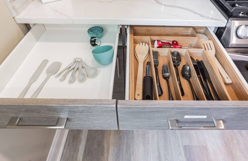 - Features a king bed, Smart TVs, full kitchen, workspace, and self check-in with e-locks.