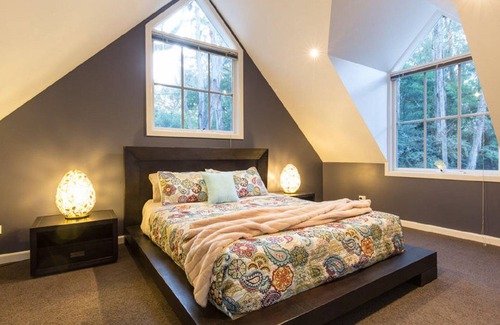 Un impresionante conjunto de casas de campo de piedra y tabla de intemperie de dos pisos entre altos árboles de goma. Despiértese con los sonidos de las aves y una vista más hermosa del bosque nativo. Relájate y disfruta de la serenidad.
