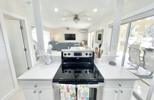 La casa de la isla tiene una cocina de tamaño completo totalmente equipada y la vista desde la cocina es impresionante. La mejor característica de la casa de la isla es el espacioso lanai de dos pisos que ofrece una vista especuladora de la cala, un lugar perfecto para el entretenimiento. Justo al lado de la cocina encontrará un área de lavandería / despensa con lavadora y secadora grandes y un tocador separado. Dé unos pasos fuera de la terraza y hay una ducha al aire libre y su propia parrilla de carbón.