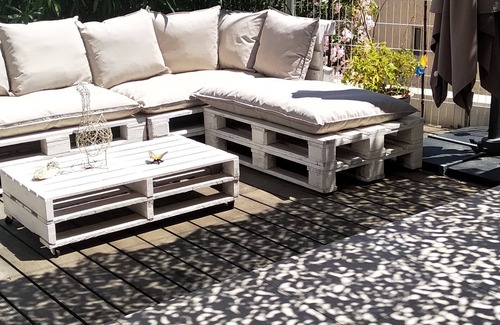 Gran terraza con sombra totalmente equipada, pequeño jardín íntimo.