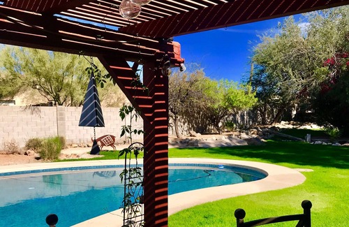 Esta maravillosa casa en 2 1/2 acres está llena de sorprendente, hermoso arte, decoración y diseño del suroeste. Las 4 habitaciones están decoradas con muebles originales hechos a mano diseñados y hechos por el propietario, pinturas excepcionales, ropa de cama de lujo suave, edredones de pluma de ganso y colchones increíbles. La comodidad es el nombre del juego y está disponible aquí en abundancia. La sala de estar cuenta con muebles de cuero suave, TV de pantalla plana grande, gran chimenea de leña y también incluye cable, netflix, wifi y una computadora e impresora para su uso. Hay maestros divididos en cada extremo de la casa con entradas separadas. La cocina cuenta con encimeras de granito, gabinetes de aliso con electrodomésticos de acero inoxidable y nuevos hornos dobles de acero inoxidable. El comedor cuenta con una enorme mesa del suroeste con capacidad para 8. La decoración del hogar es increíble con una atención meticulosa a los detalles y al equilibrio. Cada habitación tiene su propio tema con abundante comodidad y lujo, las habitaciones tienen ventiladores de techo, sábanas de hilo alto, hermosa decoración con TV en cada habitación. Las baldosas de Saltillo en toda la casa, el piso suroeste típico se han actualizado con alfombras para mejorar el aspecto de esta casa. Hay mucho estacionamiento disponible para remolques, camiones o cualquier otro vehículo que pueda traer de vacaciones. Este propietario es un ávido jugador de golf y tiene una gran cantidad de conocimiento local, estaría feliz de compartir el conocimiento local y ayudar con descuentos en algunos de los mejores campos en cualquier lugar. También posee otras 3 propiedades de vrbo en Phoenix, sus números son: 686871, 1170488 y 357841, lo alienta a que busque y lea los comentarios de los visitantes que han alquilado de ella que ha publicado su propiedad en el sitio web de vrbo. Un increíble patio trasero es el lugar perfecto para disfrutar al aire libre o cenar en el patio cubierto con la gran parrilla de gas Weber.