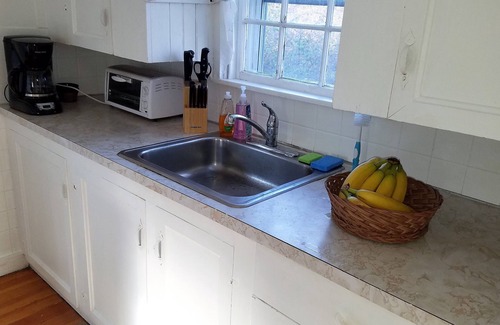 La cocina tiene una cocina a gas y está completamente equipada con microondas, horno tostador, tostadora, licuadora, sartenes, ollas, platos, utensilios y recipientes de almacenamiento. Ventana sobre el fregadero da a la cala y la mesa de picnic y parrilla de gas.